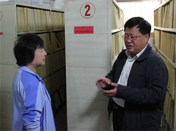 (董事长荣长远向任珑副会长介绍档案室)