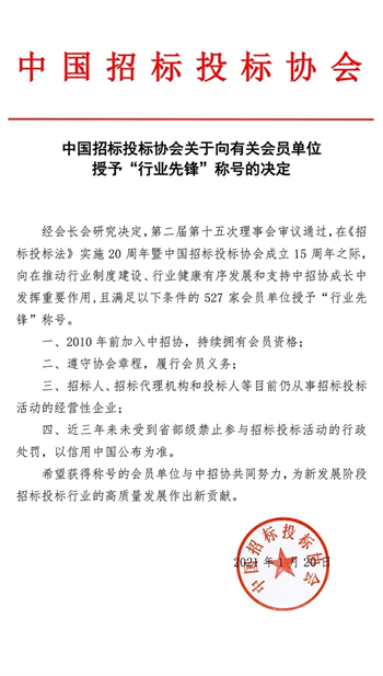 1月20日,網上賭博平台有限责任公司获中国招标投标协会授予“行业先锋”称号。面对国内外经济社会发展的新形势和市场对招标工作的新要求,網上賭博平台有限责任公司将继续以敏锐的改革意识,严谨的工作作风,规范的运行方式,一流的服务水平,按着服务第一、信誉至上、创新高效的经营方针,提供全方位的贴心服务。