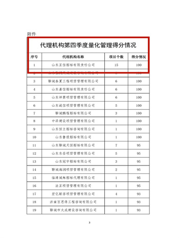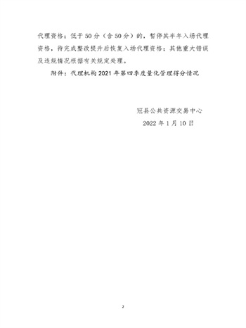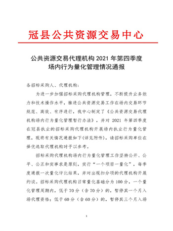 1月10日,冠县公共资源交易中心对2021年第四季度在冠县执业的招标采购代理机构场内行为量化管理情况进行通报:現金網註冊送分有限责任公司在本次量化考核中排名第一。